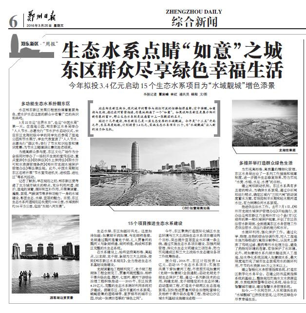 記者 覃巖峰 林紅 通訊員 楊陽 文/圖 站在鄭東新區(qū)街頭,現(xiàn)代城市的繁華與湖泊河流的恬靜相得益彰;空中俯瞰,如意湖與龍湖,通過運(yùn)河緊密相連,形象地構(gòu)造了一個(gè)“如意”。如果說鄭東新區(qū)是展示鄭州新形象的窗口,那么生態(tài)水系則是這扇窗口上一張靚麗的名片。 經(jīng)過十幾年建設(shè),鄭東新區(qū)已是一座生態(tài)宜居的水域靚城。今年是“十三五”開局之年,東區(qū)再度起航,計(jì)劃投資3.4億元,實(shí)施生態(tài)水系項(xiàng)目15個(gè),為“水域靚城”注入新的活力和生機(jī)。 多功能生態(tài)水系扮靚東區(qū) 水在鄭東新區(qū)發(fā)展歷程里扮演著重要角色,愛水護(hù)水在這里的群眾中有著廣泛的共識(shí)和共鳴。 3月22日是“世界水日”,也是“中國水周”第一天。在濕地公園,鄭東新區(qū)水務(wù)局舉辦“人人節(jié)水、志愿先行”節(jié)水護(hù)水啟動(dòng)儀式,來自東區(qū)龍翔初級(jí)中學(xué)的同學(xué)先后參觀了濕地公園和節(jié)水展廳,學(xué)生代表宣讀了“人人節(jié)水、志愿先行”倡議書;舉行了節(jié)水知識(shí)搶答和猜詞競賽;為節(jié)水主題演講比賽優(yōu)勝者頒獎(jiǎng)。 為提高群眾參與度,東區(qū)文化廣場作為分會(huì)場同時(shí)舉辦了一場別開生面的宣傳活動(dòng),重點(diǎn)宣講《水法》《防洪法》《水土保持法》《取水許可和水資源管理?xiàng)l例》《鄭州市龍湖水域保護(hù)管理辦法》等法律法規(guī)。此外,中國水周期間東區(qū)還將開展“節(jié)水宣傳進(jìn)機(jī)關(guān)、進(jìn)校園、進(jìn)社區(qū)”等系列活動(dòng)。 記者了解到,早在規(guī)劃之初,鄭東新區(qū)便考慮了北方城市缺水的特點(diǎn),充分利用河道、湖泊、濕地的調(diào)蓄、循環(huán)和互補(bǔ)作用,開展集調(diào)蓄、灌溉、景觀、氣候調(diào)節(jié)等多種功能于一身的水域建設(shè),彰顯生態(tài)、水綠、宜居的魅力。目前,東區(qū)生態(tài)水系河道規(guī)劃總長度約108公里,水域面積約16平方公里,包括“五湖八河五渠”。 15個(gè)項(xiàng)目推進(jìn)生態(tài)水系建設(shè) 生態(tài)水綠,東區(qū)如畫好風(fēng)光。這里如詩如畫:如意湖平淌如境,與龍湖相連接,龍湖通過魏河連著龍子湖,匯入賈魯河的魏河又與象湖相通,湖河相連,構(gòu)成鄭東新區(qū)完整的水生態(tài)系統(tǒng)。 在水系建設(shè)上,始終堅(jiān)持高標(biāo)準(zhǔn)、高起點(diǎn),以龍湖、龍子湖、象湖為三大主戰(zhàn)場,按照《鄭東新區(qū)水系規(guī)劃》,全力推進(jìn)生態(tài)水系基礎(chǔ)設(shè)施建設(shè)。 龍湖調(diào)蓄池工程順利完工,龍子湖工程湖體工程全面完工,賈魯河疏挖整治,楊橋干渠升級(jí)改造,魏河、七里河、潮河下游綜合治理工程積極推進(jìn)……2015年,東區(qū)投資4.25億元,完整的生態(tài)水系循環(huán)利用系統(tǒng)初步建成。俯瞰東區(qū),層次豐富的水系景觀,蜿蜒密集的道路綠帶,星羅棋布的城市公園,織成一張滿目蒼翠的“綠色之網(wǎng)”。 今年,東區(qū)聚焦打造國際化城區(qū)水生態(tài)環(huán)境與三大主戰(zhàn)場生態(tài)水系項(xiàng)目建設(shè)兩個(gè)目標(biāo),突出提升宜居宜業(yè)水環(huán)境一條主線,通過實(shí)施生態(tài)水系項(xiàng)目建設(shè)、加強(qiáng)河湖管理、深化水生態(tài)文明建設(shè)三項(xiàng)任務(wù),努力實(shí)現(xiàn)建成區(qū)和三大主戰(zhàn)場水生態(tài)建設(shè)各項(xiàng)工作統(tǒng)籌推進(jìn)。 據(jù)介紹,2016年,東區(qū)計(jì)劃投資3.4億元,啟動(dòng)15個(gè)生態(tài)水系項(xiàng)目:實(shí)施東風(fēng)渠下穿如意河工程,年底前實(shí)現(xiàn)如意河(龍湖—如意湖)全段通航;啟動(dòng)龍湖龍子湖生態(tài)保護(hù)工程,通過一系列新技術(shù)的應(yīng)用,構(gòu)建龍湖、龍子湖穩(wěn)定的水生態(tài)環(huán)境;啟動(dòng)蓮湖工程,打造龍子湖南區(qū)生態(tài)濕地景觀;加快推進(jìn)賈魯河綜合治理配套綠化及楊橋干渠升級(jí)改造等工程,推動(dòng)白沙區(qū)域水利基礎(chǔ)設(shè)施建設(shè)進(jìn)程…… 多措并舉打造群眾綠色生活 為實(shí)現(xiàn)高標(biāo)準(zhǔn)、高質(zhì)量的精細(xì)化管理,東區(qū)水務(wù)局出臺(tái)了一系列工作措施和規(guī)章制度,進(jìn)一步提升生態(tài)修復(fù)效果,努力實(shí)現(xiàn)“水美、水暢、水足、水清”的目標(biāo)。 建立閘壩聯(lián)動(dòng)機(jī)制。東區(qū)水系具有多且密的特點(diǎn),為確保水系景觀,通過分析閘壩運(yùn)行特點(diǎn),確定區(qū)域內(nèi)“三壩六閘”聯(lián)動(dòng)調(diào)度蓄水方案,有效控制豐水期和枯水期河道水位,有力保障沿河水系景觀。 推進(jìn)依法治水工作。去年7月1日,《鄭州市龍湖水域保護(hù)管理辦法》開始施行,該辦法是鄭東新區(qū)乃至鄭州市12個(gè)縣(市)區(qū)頒布的第一部水域保護(hù)規(guī)章,開創(chuàng)了東區(qū)依法管水新局面,全面提高東區(qū)水務(wù)管理工作者依法管水、依法行政的能力和水平。 水循環(huán)利用,強(qiáng)化保護(hù)工作。通過化學(xué)、物理、生物的綜合協(xié)調(diào)作用,對(duì)人工濕地水體污染物進(jìn)行高效分解凈化,從技術(shù)上摒棄了傳統(tǒng)過濾、撒藥等污水處理方法,避免了藥物對(d