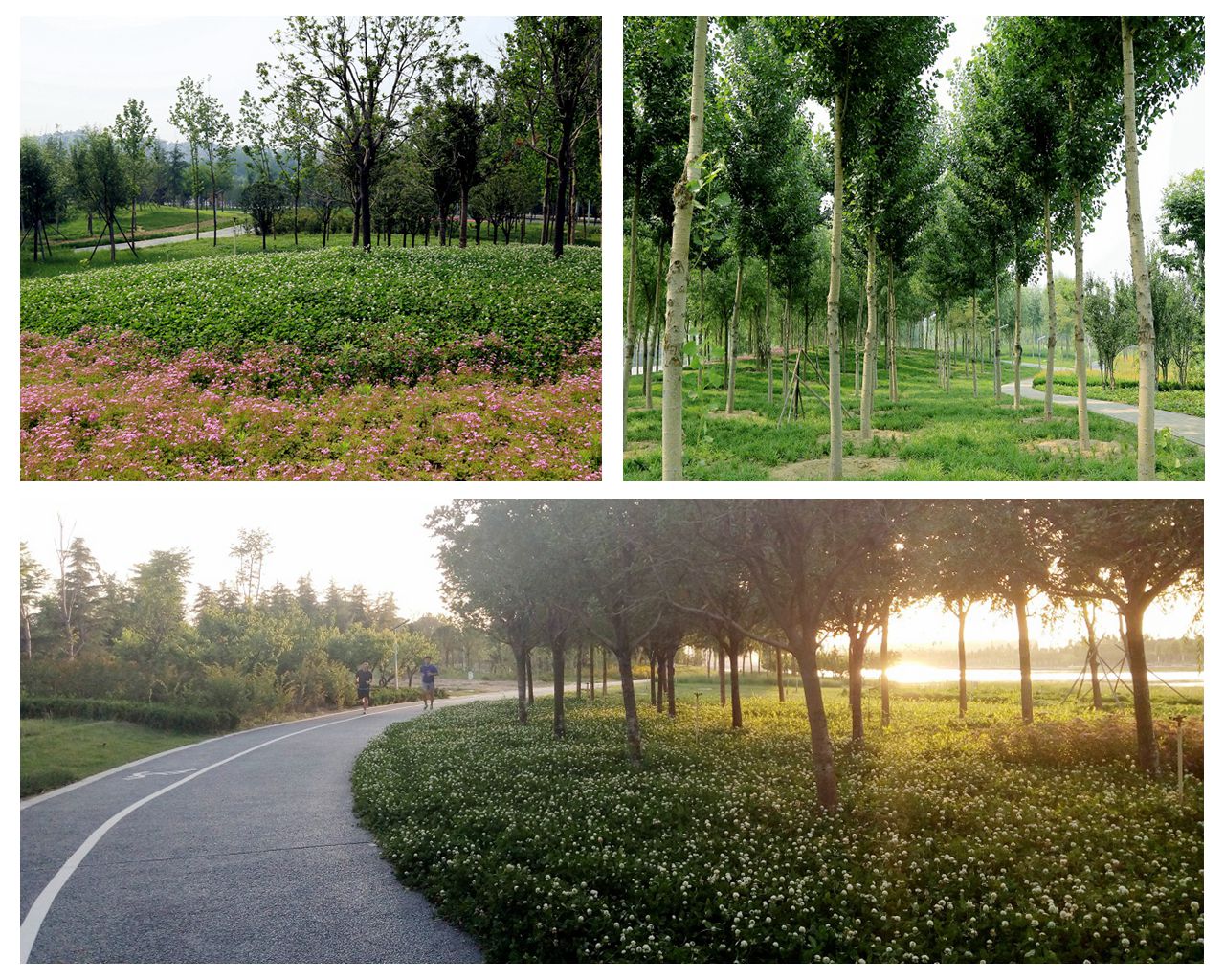 通過簡潔流暢的地形,以及大面積的草坪和高大喬木組合,塑造出疏林草地的景觀效果,節奏舒緩、富有韻律。漫步林中,視線時而疏朗、時而幽閉。同時,栽植矮生波斯菊、黑心菊、大濱菊,馬藺、常夏石竹、蒲公英、金雞菊、紅花酢漿草、紅王子錦帶、玉簪等等數十種草本花卉,一年之中,春夏秋三季花開不絕,芬芳馥郁。走進其中,感受到的是充滿活力、蓬勃向上的熱烈氛圍,體驗的是有山有水、心曠神怡的生態自然。
