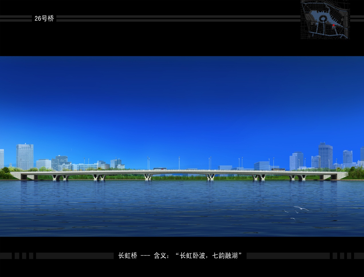 龍湖內環跨龍尾河橋位于龍湖主體東側的環路上,橋梁全長253米,“長虹臥波,七韻融湖”是該橋的主要設計理念。由于臨近的北三環跨東運河橋為斜拉橋橋型,為避免景觀重復等因素,龍湖內環跨龍尾河橋確定為七孔連續變截面預應力混凝土箱梁V構連續橋。橋梁采用微拱和漸變敦距的手法,與簡潔現代的“V”形墩造型相結合,營造出既富有古典韻律變化又具有現代簡約、輕盈通透特點的七孔長橋,充分體現龍湖自然純樸之美,七孔的韻律又如七個音律的樂曲,譜寫一曲韻律優美的城市美好未來之曲。